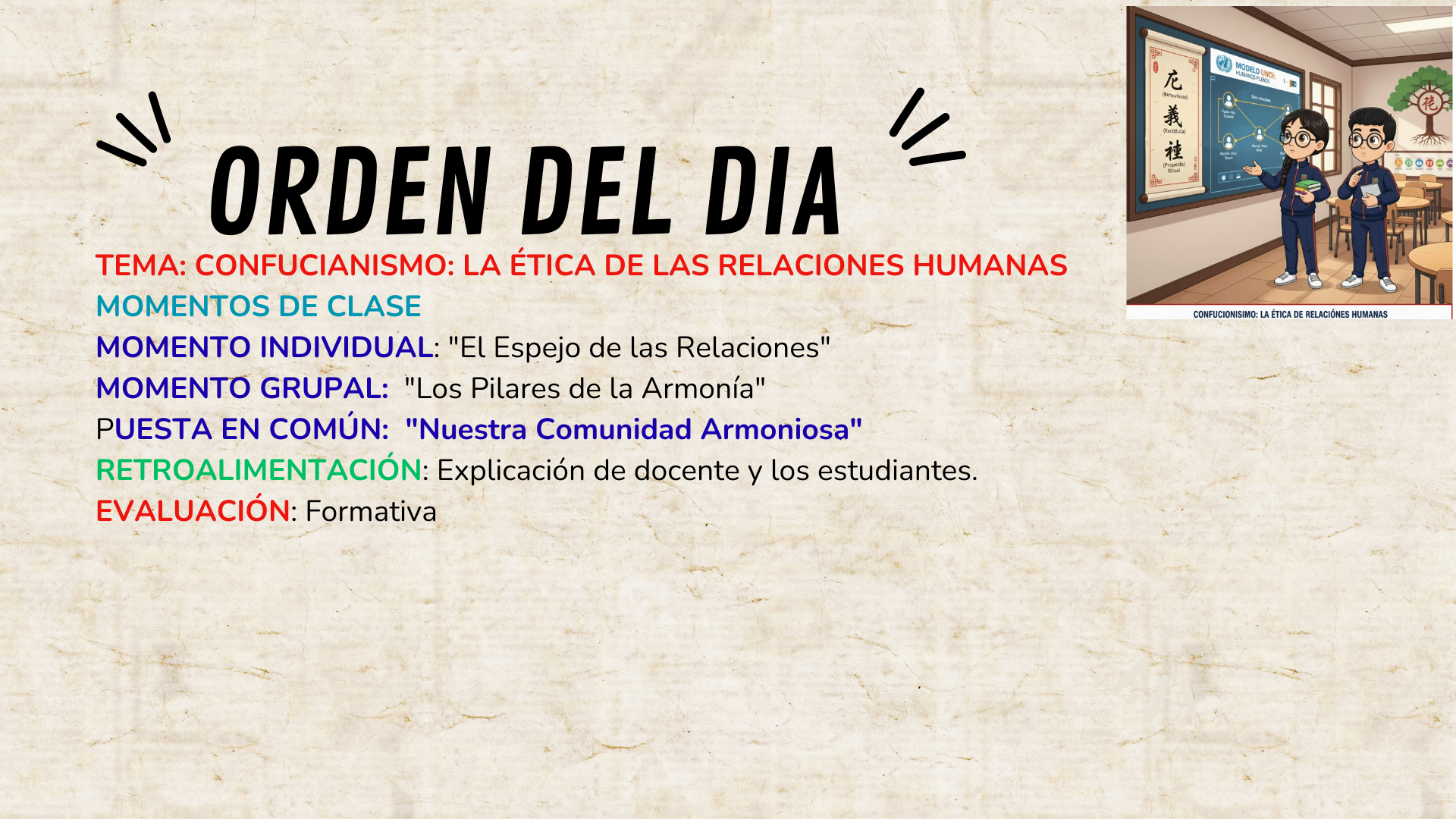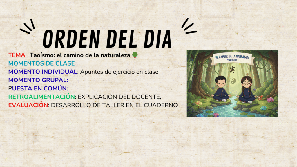 (Como se ve en la imagen de referencia, los estudiantes trabajan en sus mapas mientras la profesora explica el Ba Gua en el tablero).
